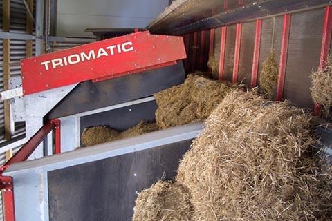 Triomatic измельчит подаваемый корм до нужного размера. Система состоит из следующих элементов: приёмные бункера с дозирующей системой, миксер кормораздатчик с вертикальными шнеками — он подвешивается на опорную балку по которой перемещается автоматически согласно программе, компьютер, управляющий работой системы.
